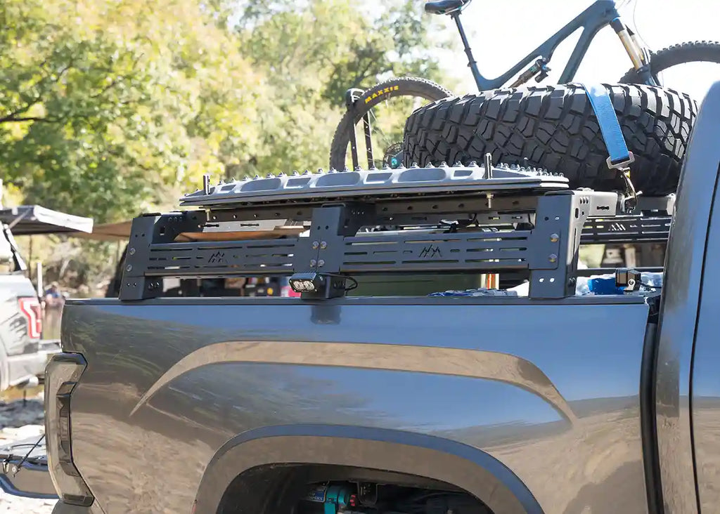 Our Mid Height Toyota Tundra Bed Rack gives you tons of customization and utility for your 2nd Gen or 3rd Gen Tundra, but in a smaller package compared to our Full-Height bed rack. This lower-profile bed rack, gives you the ability to keep your roof top tent in line with your cab to minimize drag and excessive height. If mounting a roof top tent isn't your thing, our rack is great for transporting mountain bikes, kayaks, a spare tire, or other adventure gear. Adding a bed rack allows you to keep the space in your actual truck bed for even more gear and space optimization.