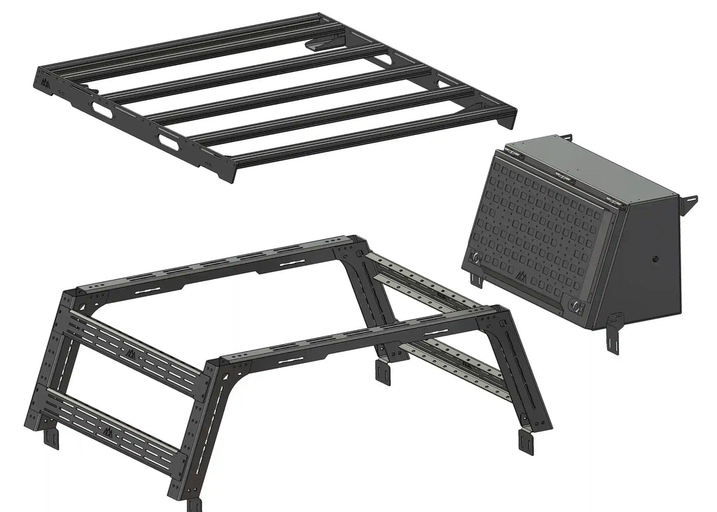 This bundle includes our Bed Rack, Bed Rack Topper, and Bed Rack Storage Box.