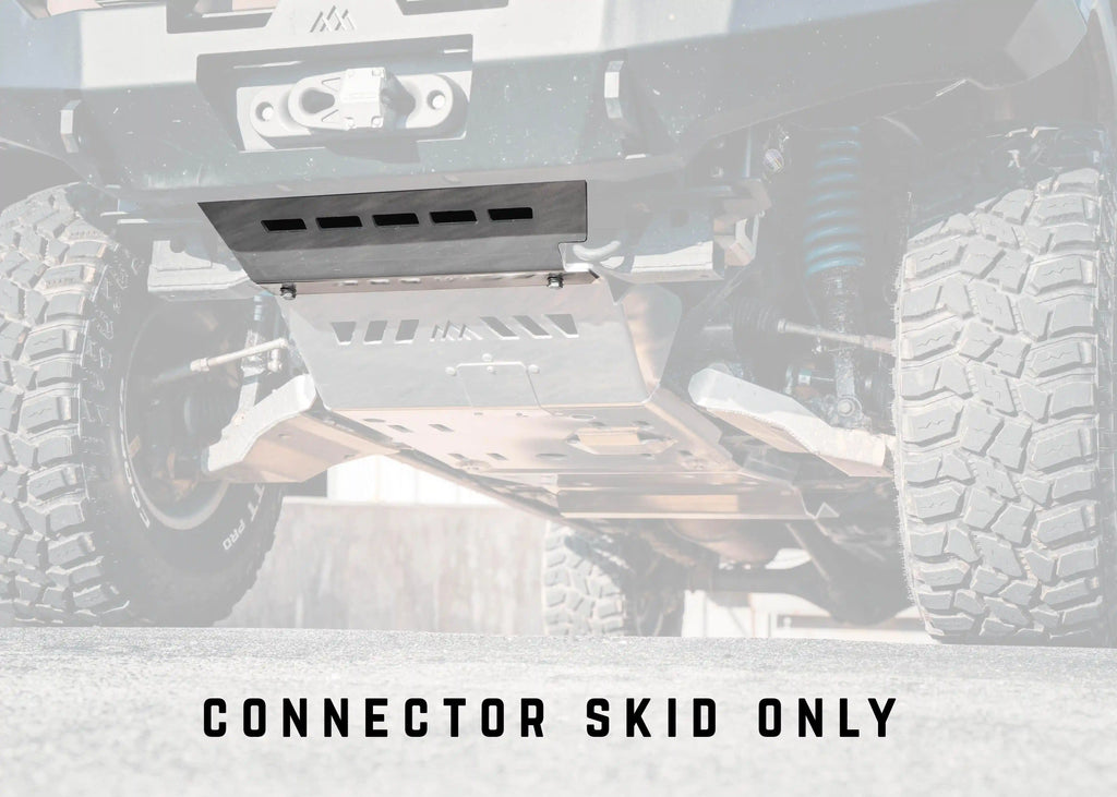 This is our connector plate for (2005-2023) Toyota Tacoma. Made from .25" aluminum, this connector plate only works with our Backwoods Tacoma Front Bumpers. It connects the bottom mount of the winch and bumper to the top of an aftermarket engine skid, providing complete front end protection. This plate mainly protects the front end cooler lines and marries the bumper to the engine skid plate for a seamless skid.