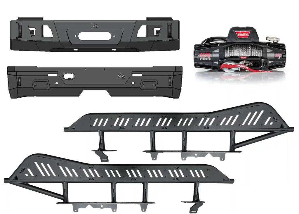 You will receive our Backwoods Hybrid front bumper, rear bumper, rock sliders, and a Warn winch.