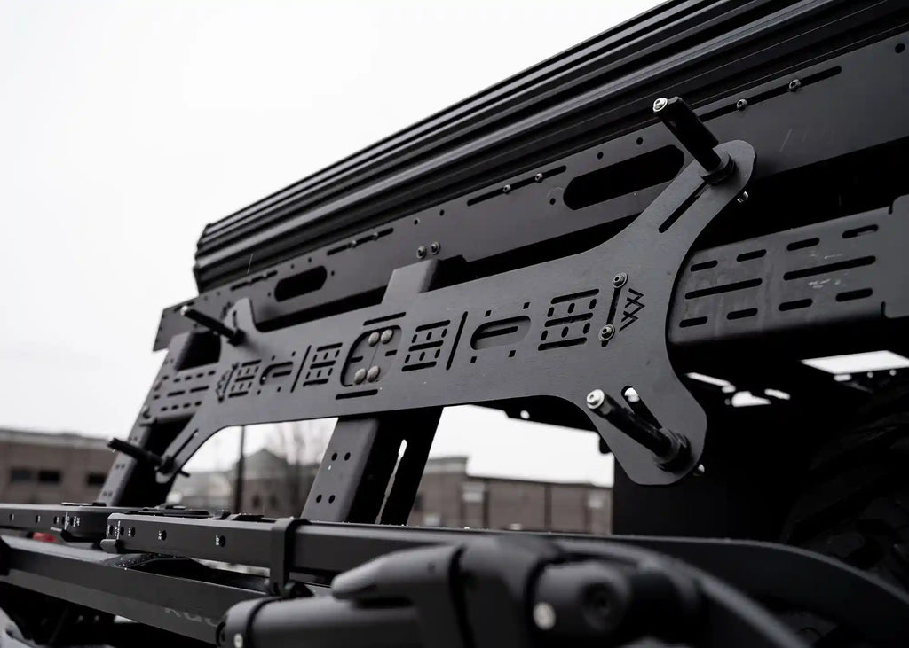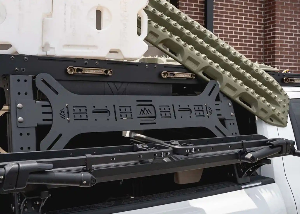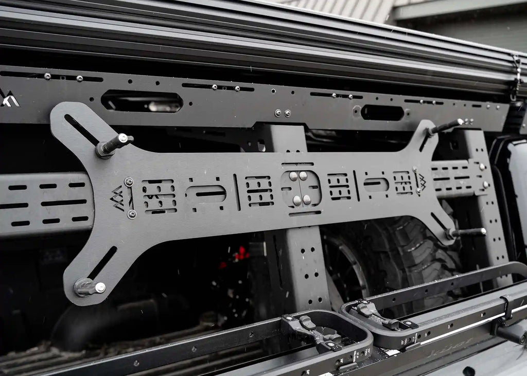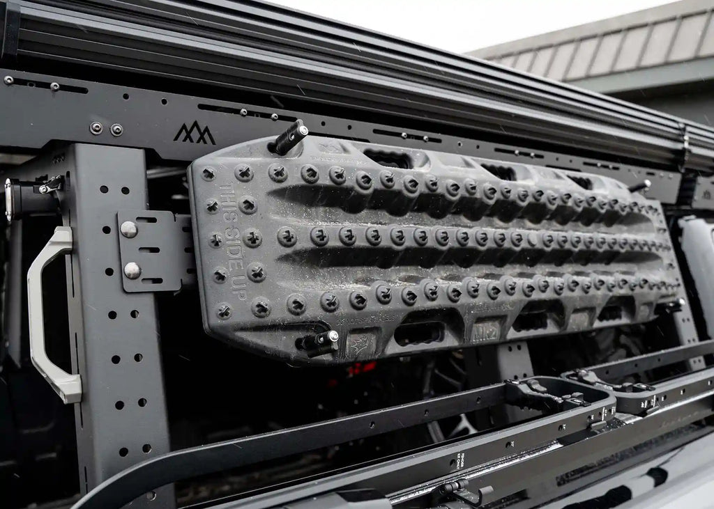 Our Universal "Dogbone" mount is an all aluminum panel that allows you to easily mount your traction boards, Rotopax, or other gear on any roof rack, bed rack, or flat surface. We have special cutouts that accept Maxtrax mounting pins and other similar traction board mounts. We also have matching cutouts to the Rotopax mounts, allowing a no drill solution to carrying extra fuel/water.